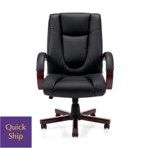 Luxhide executive high back chair with an integral headrest in black Luxhide. Featuring wood arms with padded arm caps, and a wood base in cordovan finish. Mechanism functions include pneumatic seat height adjustment, and single position tilt lock with tilt tension adjustment.