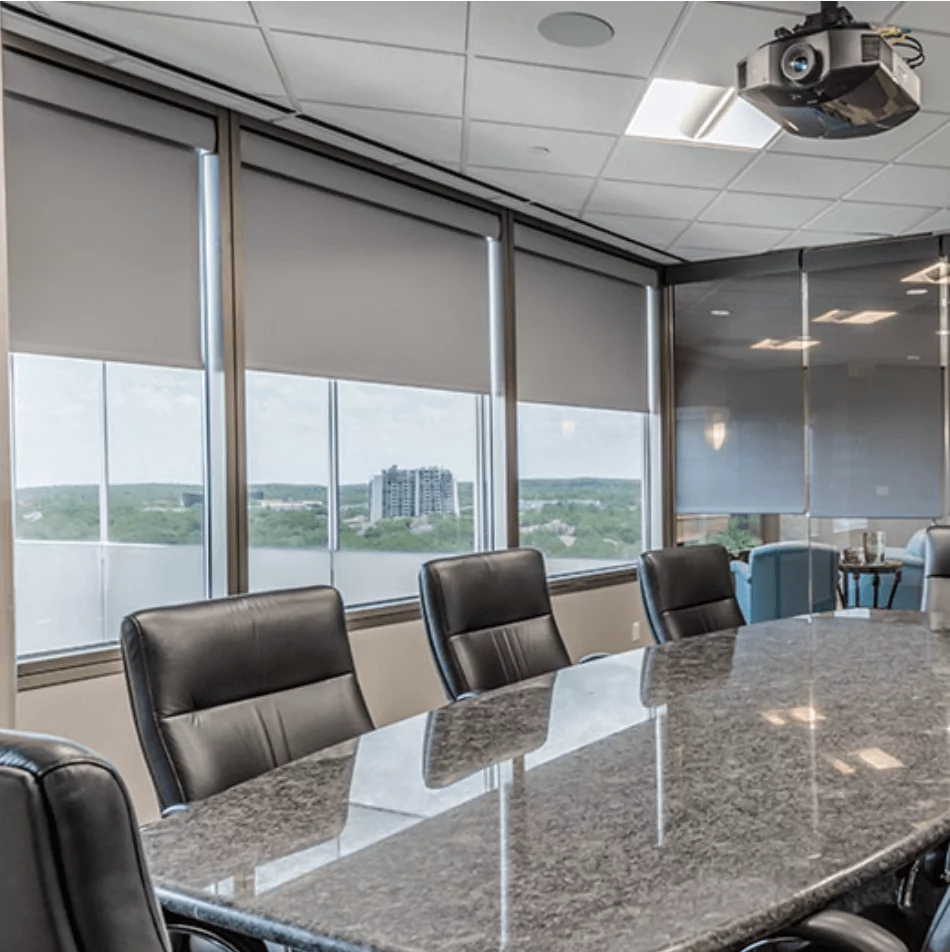 Mesh roller shades offer a shading system that will allow for the benefits of natural light to be part of a commercial space while offering a solution to limit that light when it can become inhibiting to productivity and focus. Commercial interior design firms like ours use high quality mesh roller shades to help offices direct sunlight in such a way that the demand on air conditioning systems is reduced.
