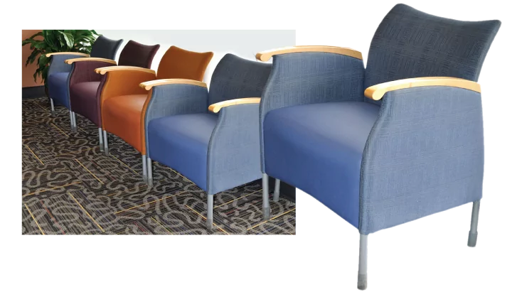 The vibrant waiting room chairs were great pre-owned finds… but the seats showed wear from use.